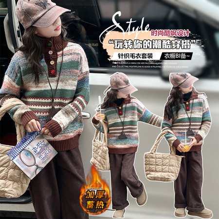 花*鱼收藏“2530款彩条毛衣一体绒条绒裤套装”